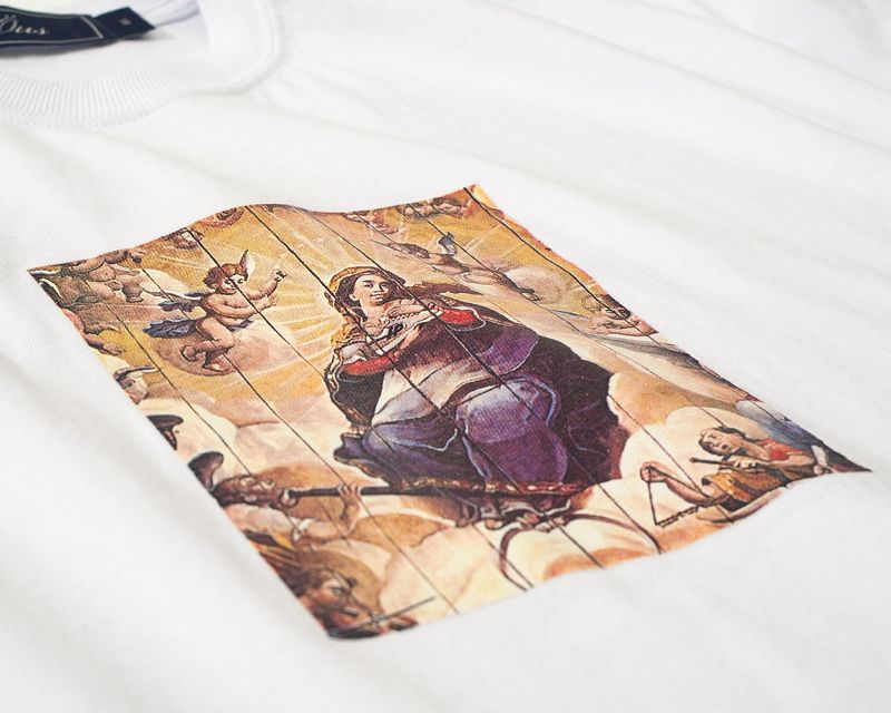 Esta camiseta é inspirada na obra “Assunção da Virgem”, que se abre no deslumbrante teto da Igreja de São Francisco de Assis, em Ouro Preto, com anjos músicos e a delicada imagem da Virgem mulata, trazendo para o cotidiano um dos maiores tesouros da arte mineira.